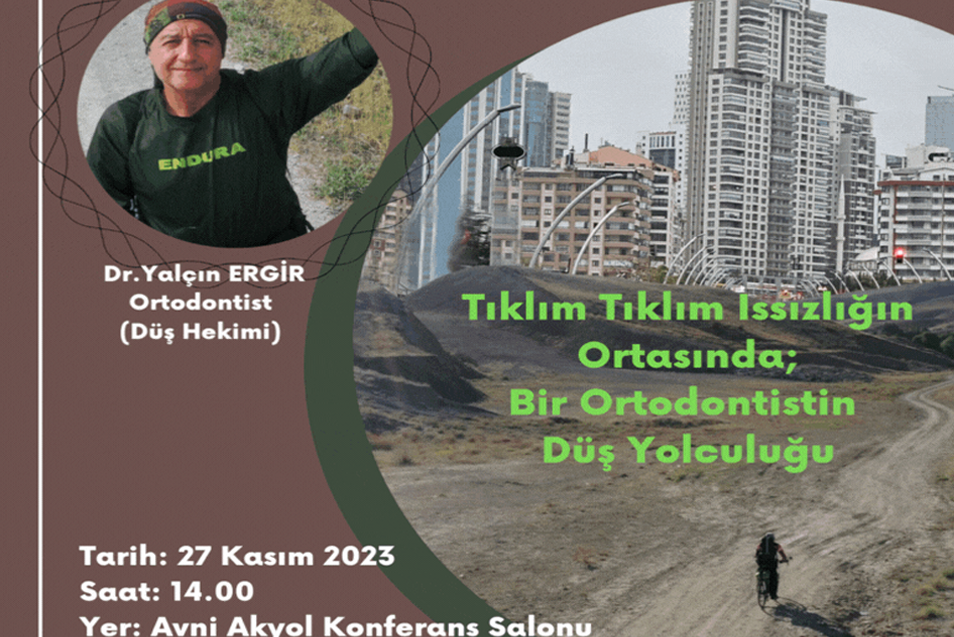27 KASIM 2023 14.00 - 16.00 Tıklım Tıklım Issızlığın OrtasındaBaşkent Üniversitesi Kültür ve Sanat Araştırmaları Merkezi (BÜKSAM) tarafından 27 Kasım 2023 Pazartesi günü Saat 14.00’ de Avni Akyol Konferans Salonu’nda “Tıklım Tıklım Issızlığın Ortasında; Bir Ortodontistin Düş Yolculuğu” başlıklı konferansı vermek üzere Ortodontist Dr. Yalçın ERGİR konuk olacaktır... |