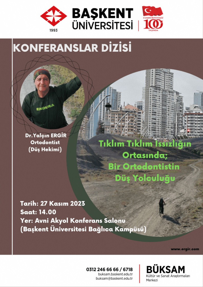 Başkent Üniversitesi Kültür ve Sanat Araştırmaları Merkezi (BÜKSAM) tarafından 27 Kasım 2023 Pazartesi günü Saat 14.00’ de Avni Akyol Konferans Salonu’nda “Tıklım Tıklım Issızlığın Ortasında; Bir Ortodontistin Düş Yolculuğu” başlıklı konferansı vermek üzere Ortodontist Dr. Yalçın ERGİR konuk olacaktır