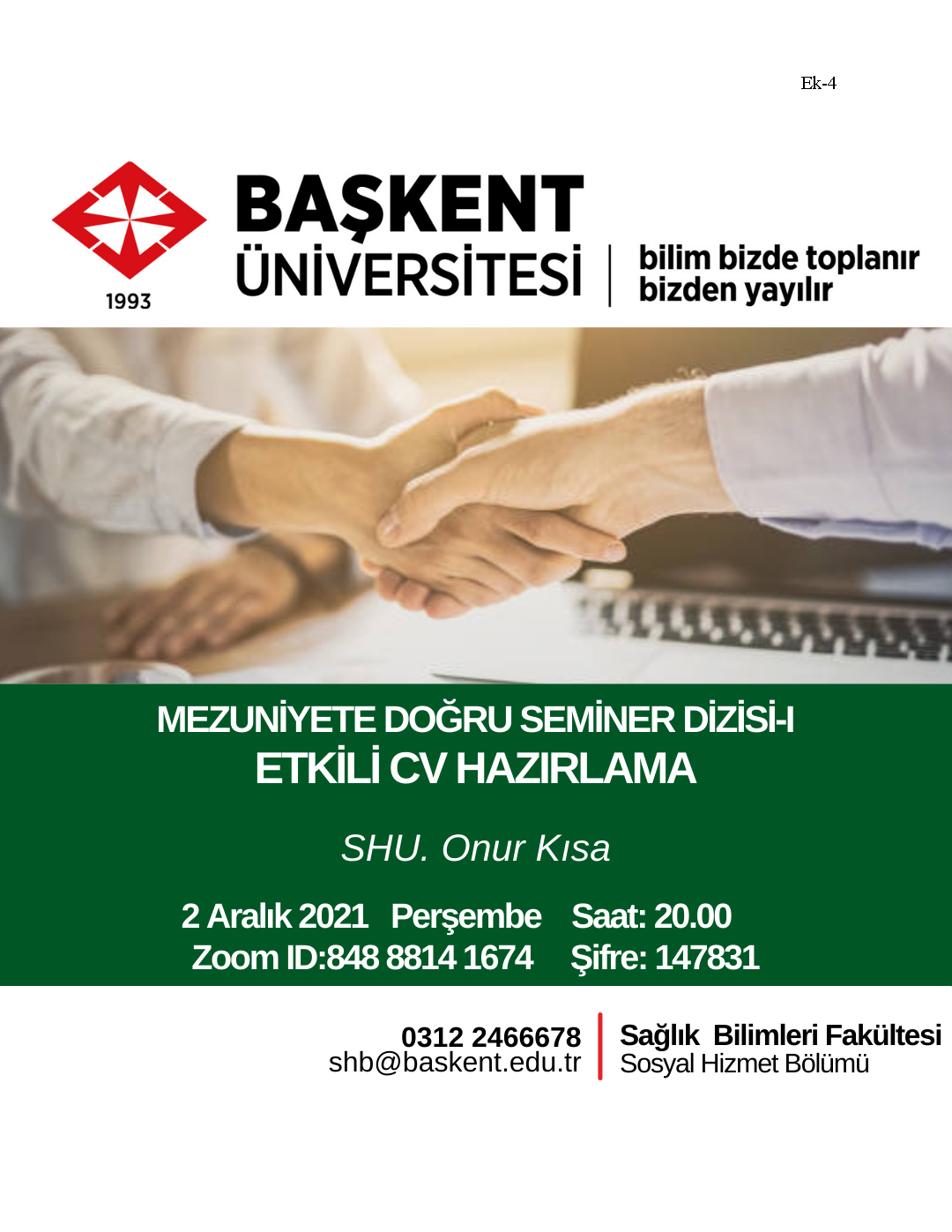 Sosyal Hizmet Bölümü tarafından 2 Aralık 2021 Saat 20.00'da çevrimiçi düzenlenecek olan Etkili CV Hazırlama konulu seminere davetlisiniz.
