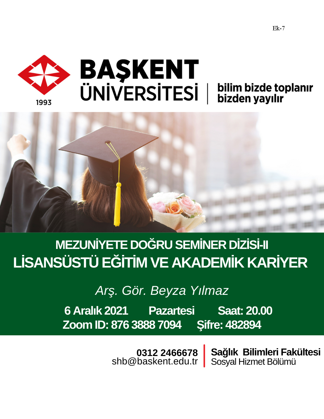 Sosyal Hizmet Bölümü tarafından 6 Aralık 2021 Saat 20.00'da çevrimiçi düzenlenecek olan Lisansüstü Eğitim ve Akademik Kariyer konulu seminere davetlisiniz.