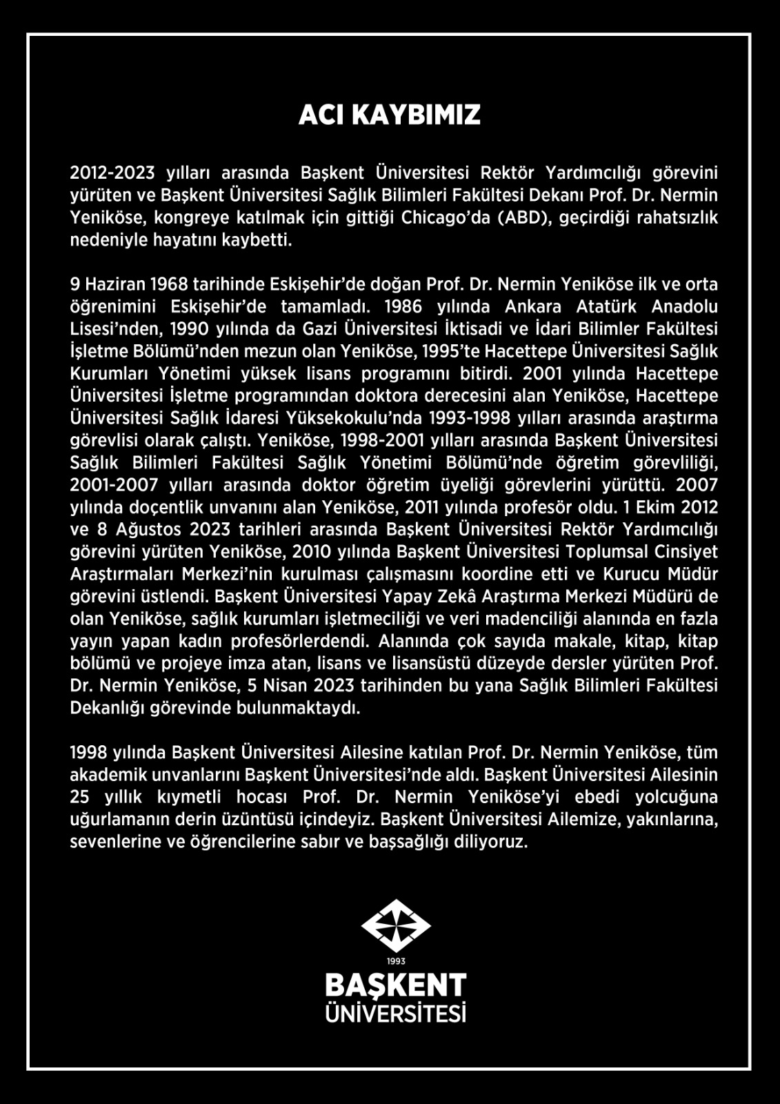 Başkent Üniversitesi 2012-2023 dönemi Rektör Yardımcısı, Sağlık Bilimleri Fakültemizin Dekanı ve 25 yıllık öğretim üyesi Prof.Dr. Nermin Yeniköse'yi kaybetmiş olmanın derin üzüntüsü içindeyiz.